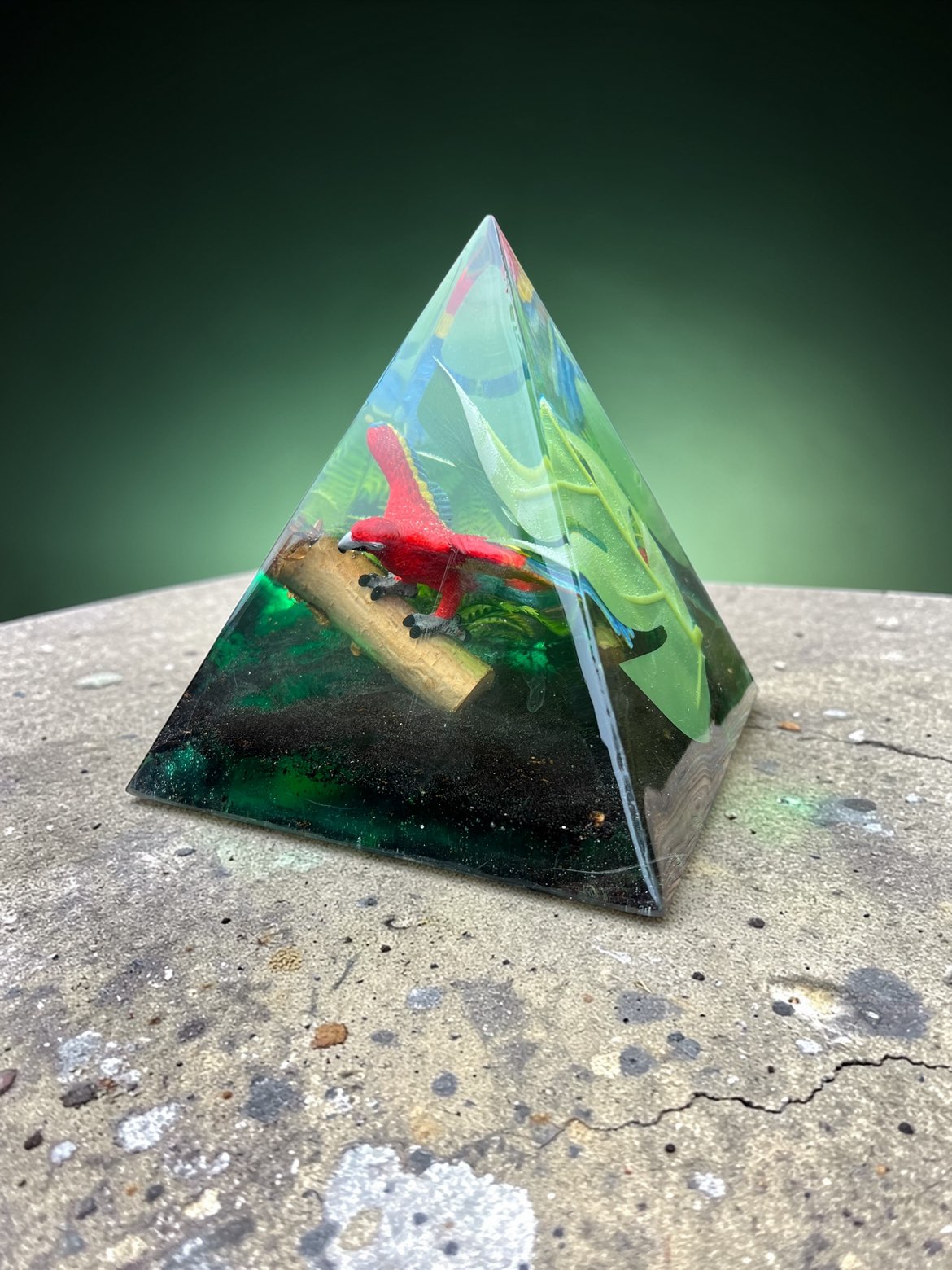 Cette pyramide colorée met en scène un magnifique perroquet posé au cœur d’une végétation luxuriante. Ses couleurs vives apportent une touche d’exotisme et évoquent la richesse des forêts tropicales.