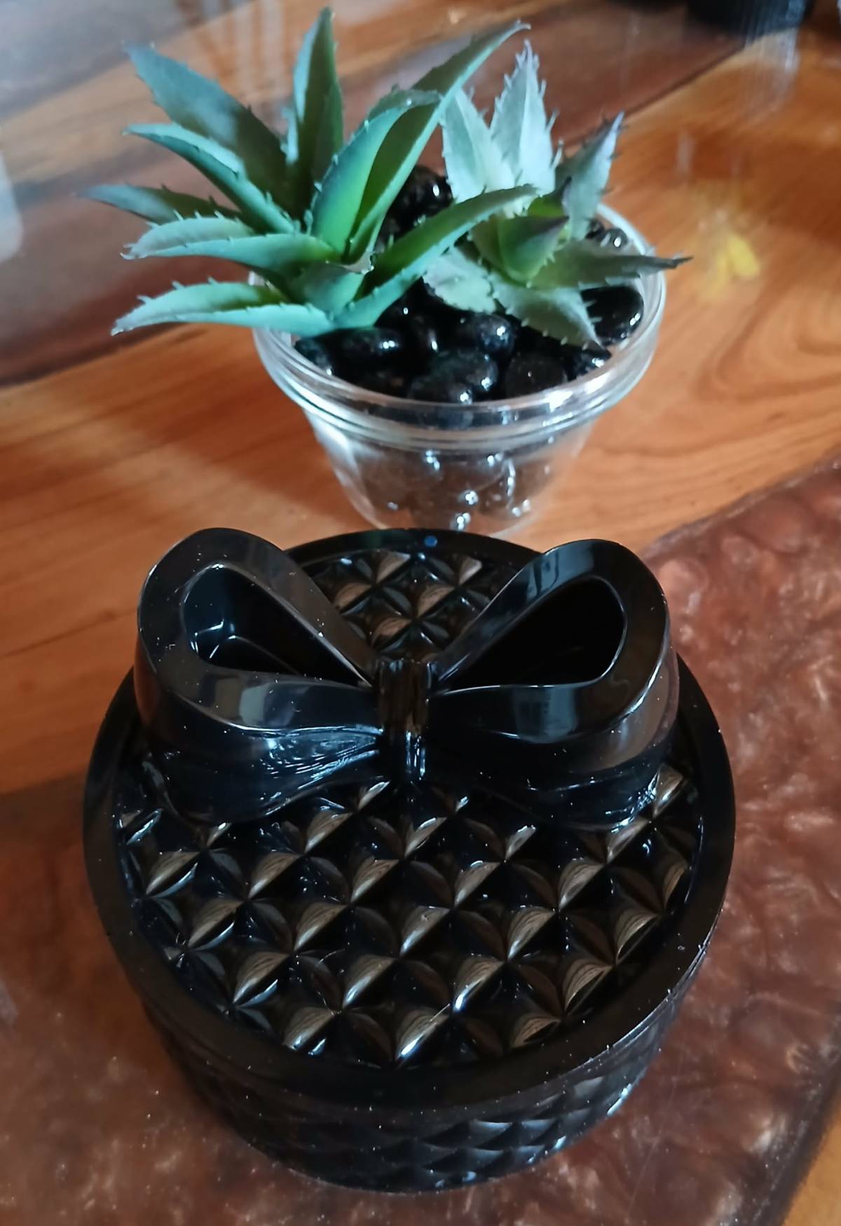 Boite élégante en résine époxy aux finitions brillantes noir profond. Son couvercle orné d un nœud et son motif géométrique en relief lui donne un style chic et moderne.