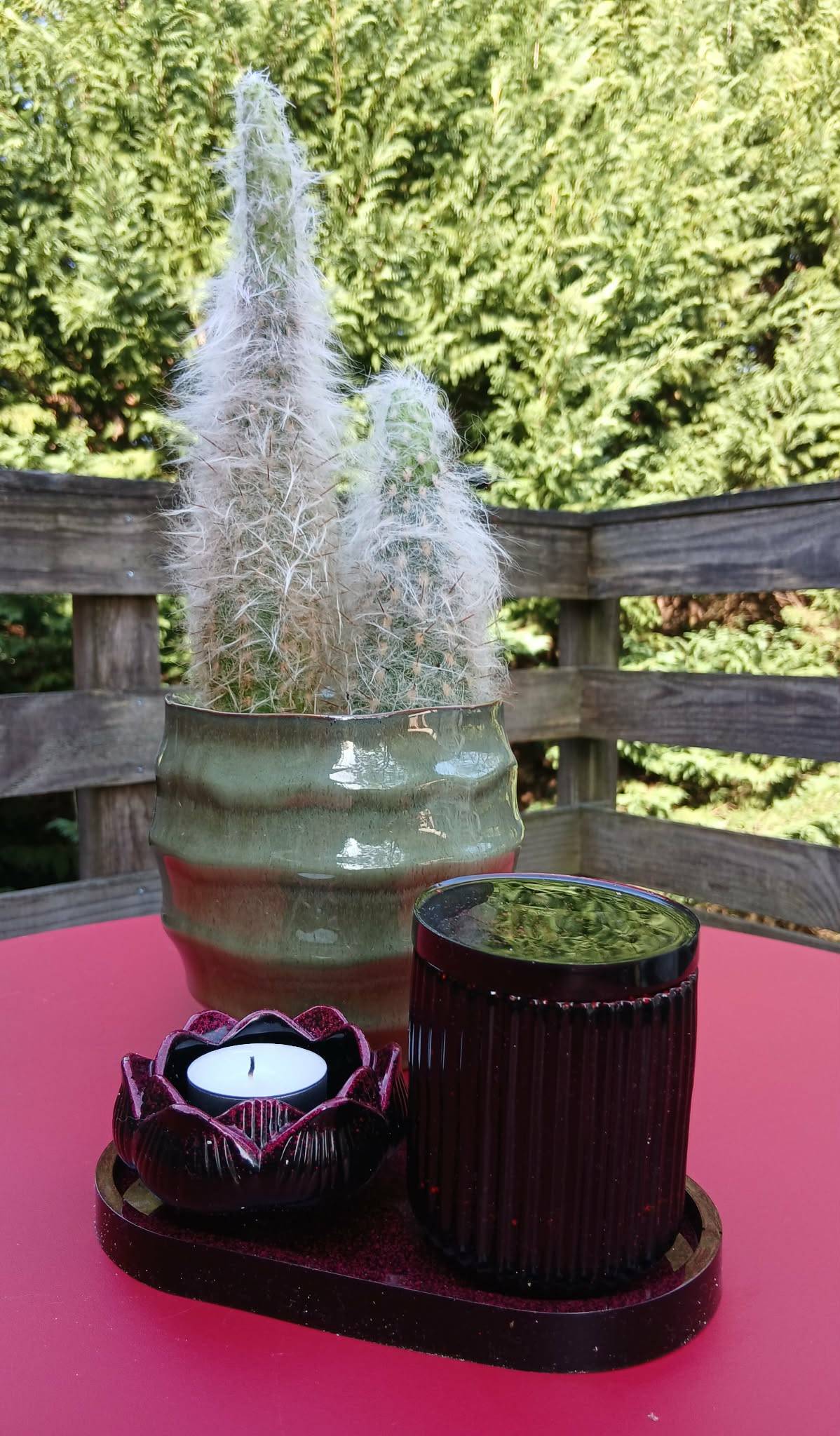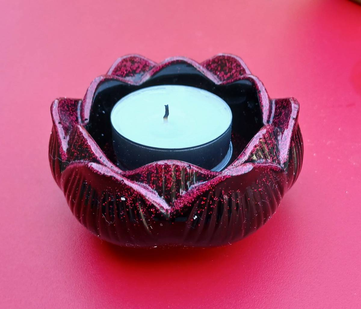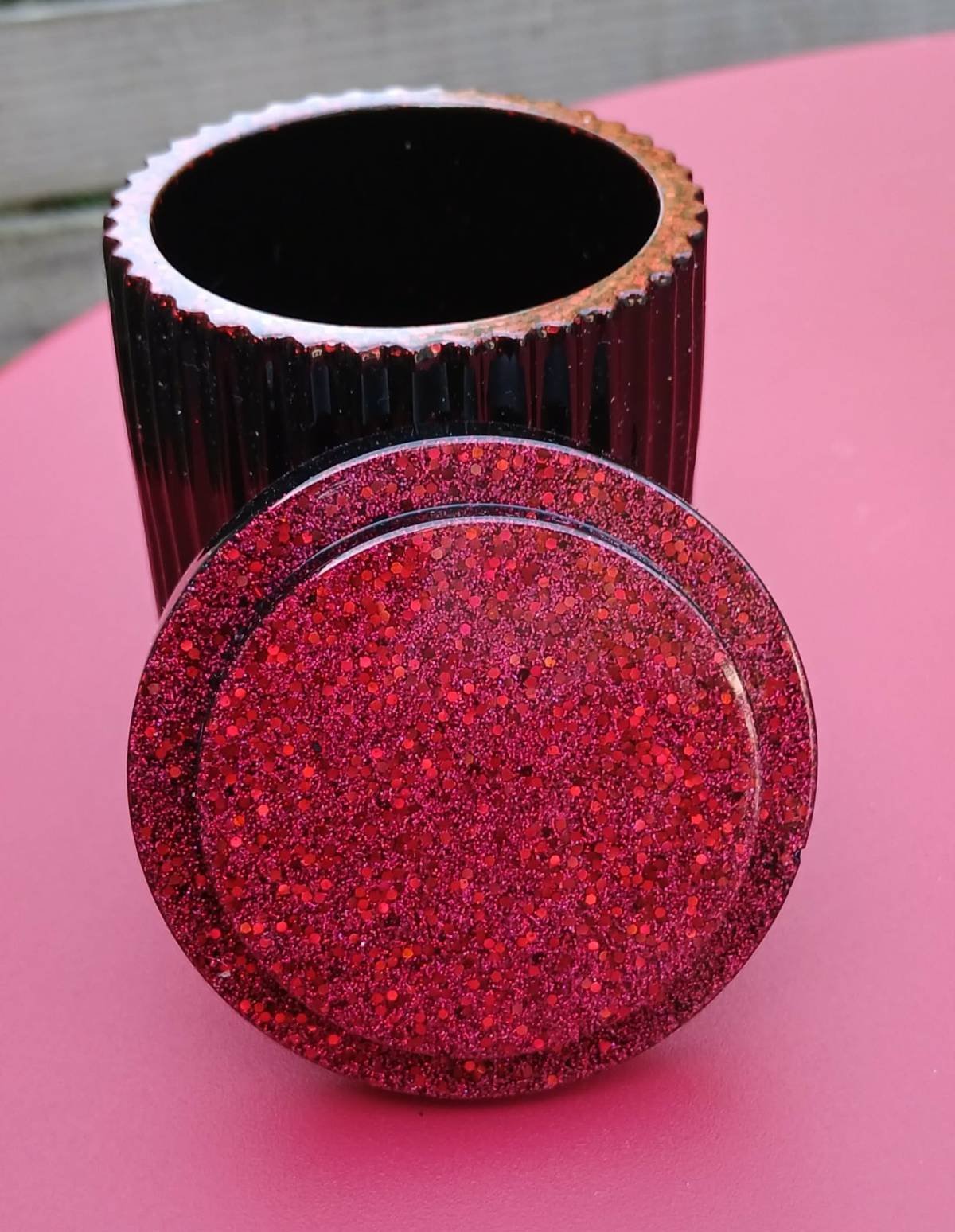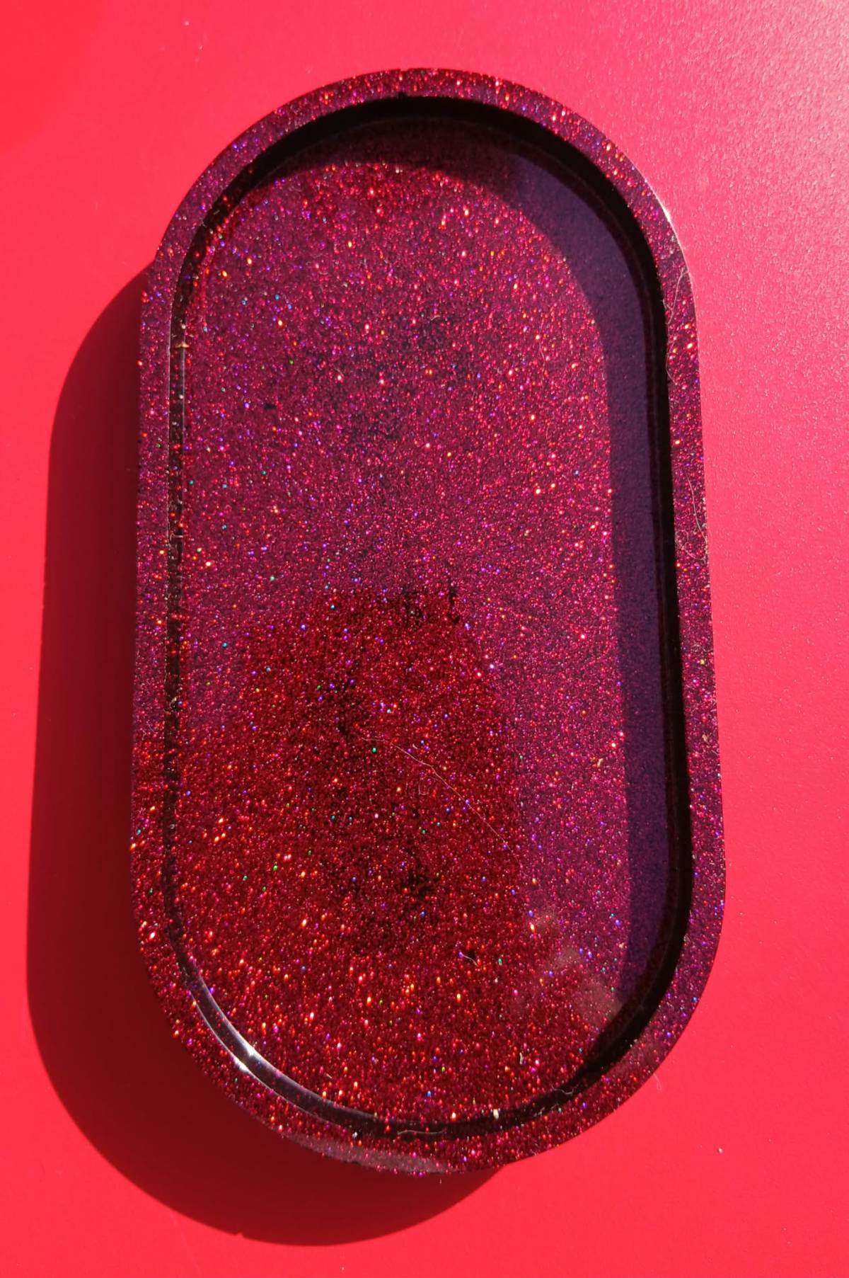 Ensemble élégant en résine époxy noir profond et rouge pailleté scintillant, composé d un plateau ovale, d un porte bougie en forme de lotus et d une boite a couvercle assorti.