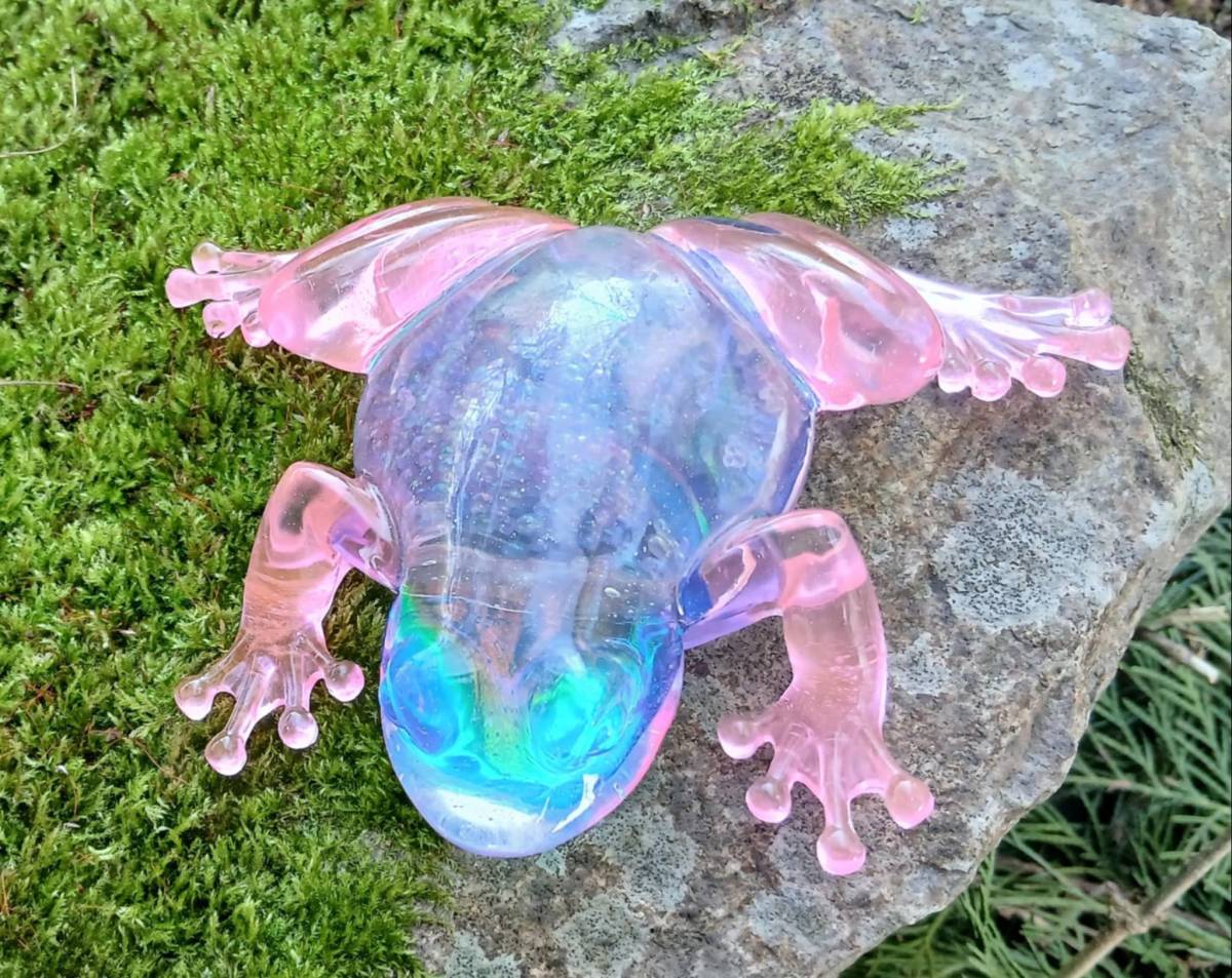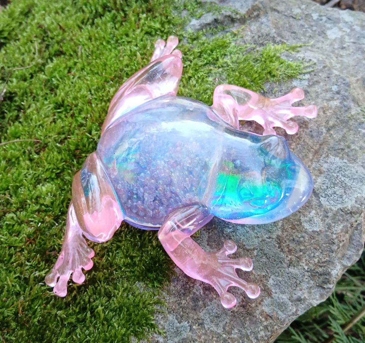 Création décorative en résine époxy aux teintes irisées mêlant rose tendre, bleu lumineux et reflets verts. Son effet translucide et scintillant crée un jeu de lumière unique, changeant selon l angle et l éclairage.