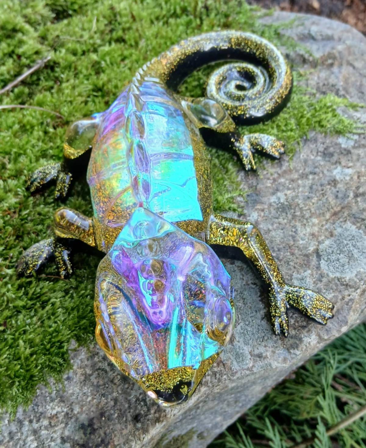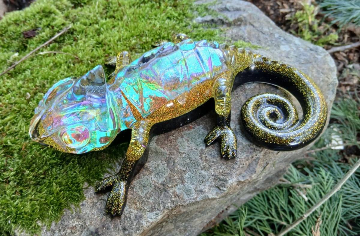création décorative en résine époxy représentant un caméléon aux contrastes intenses noir profond et or scintillant. Son corps translucide aux reflets irisés capte la lumière et révèle des éclats multicolores, créant un effet spectaculaire et raffiné.