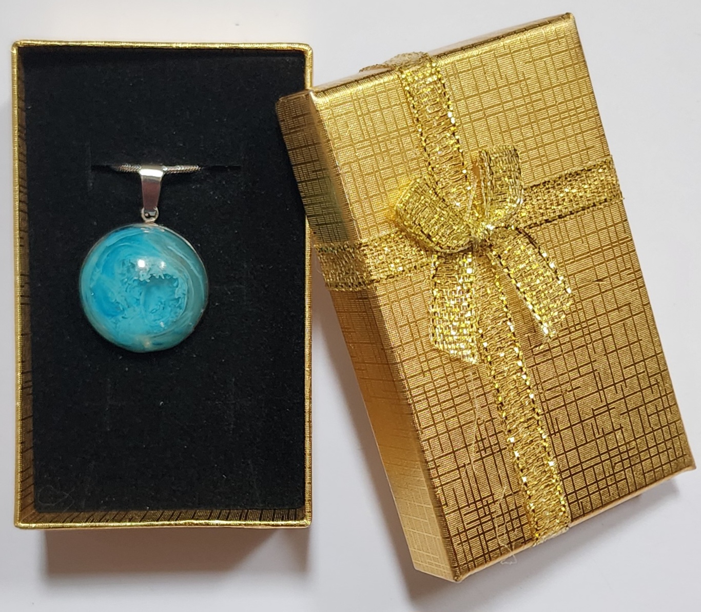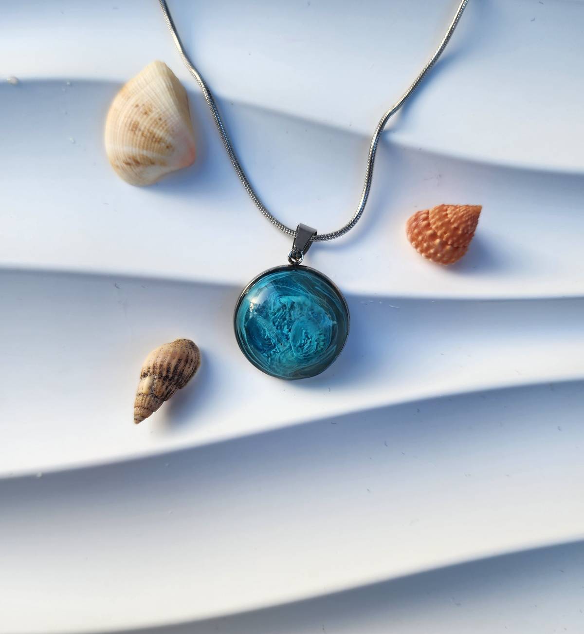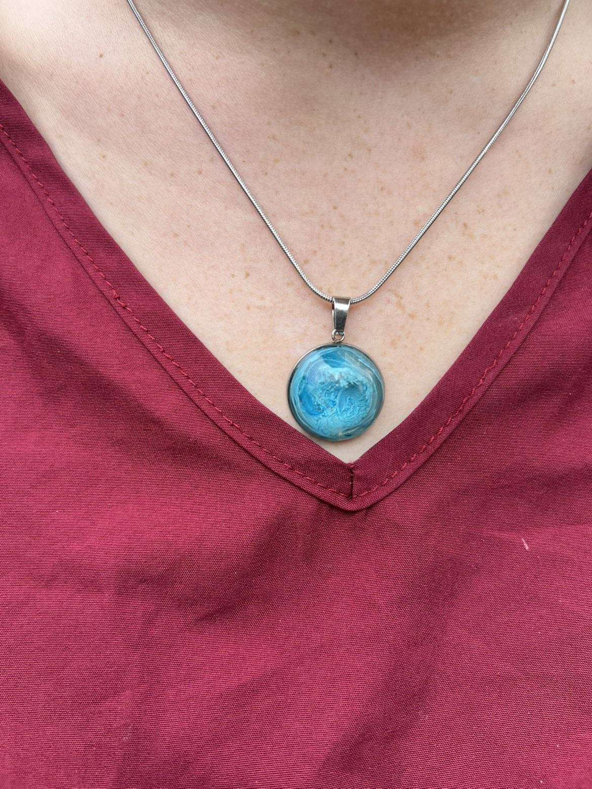Ce collier rond aux nuances bleu océan capture le mouvement et la profondeur de la mer. Ses reflets évoque une vague en mouvement, comme un fragment d'océan porté autour du cou.