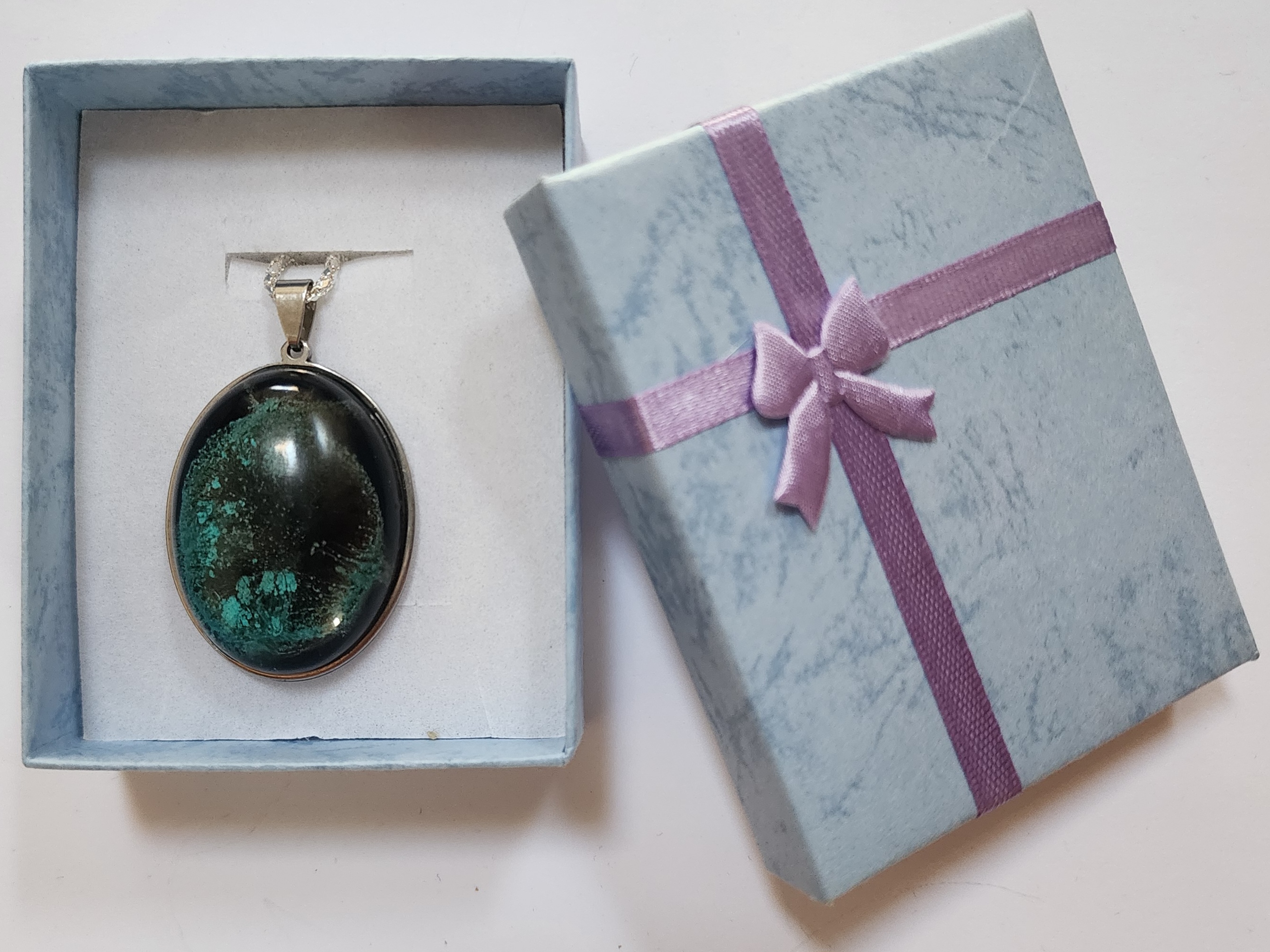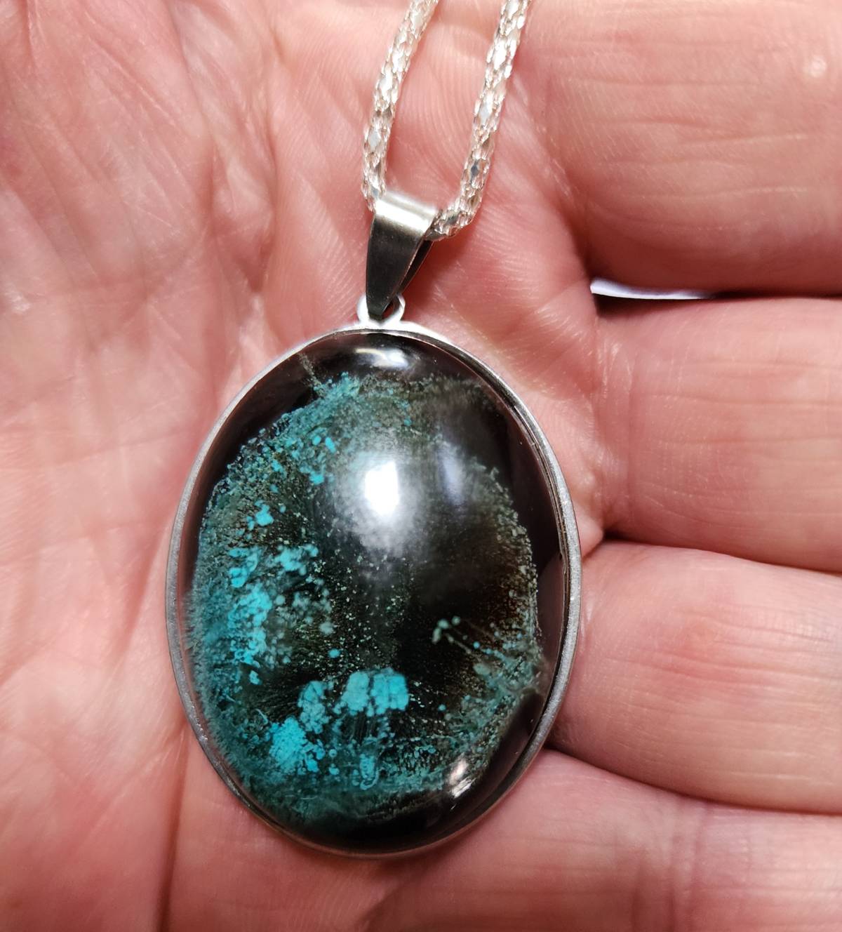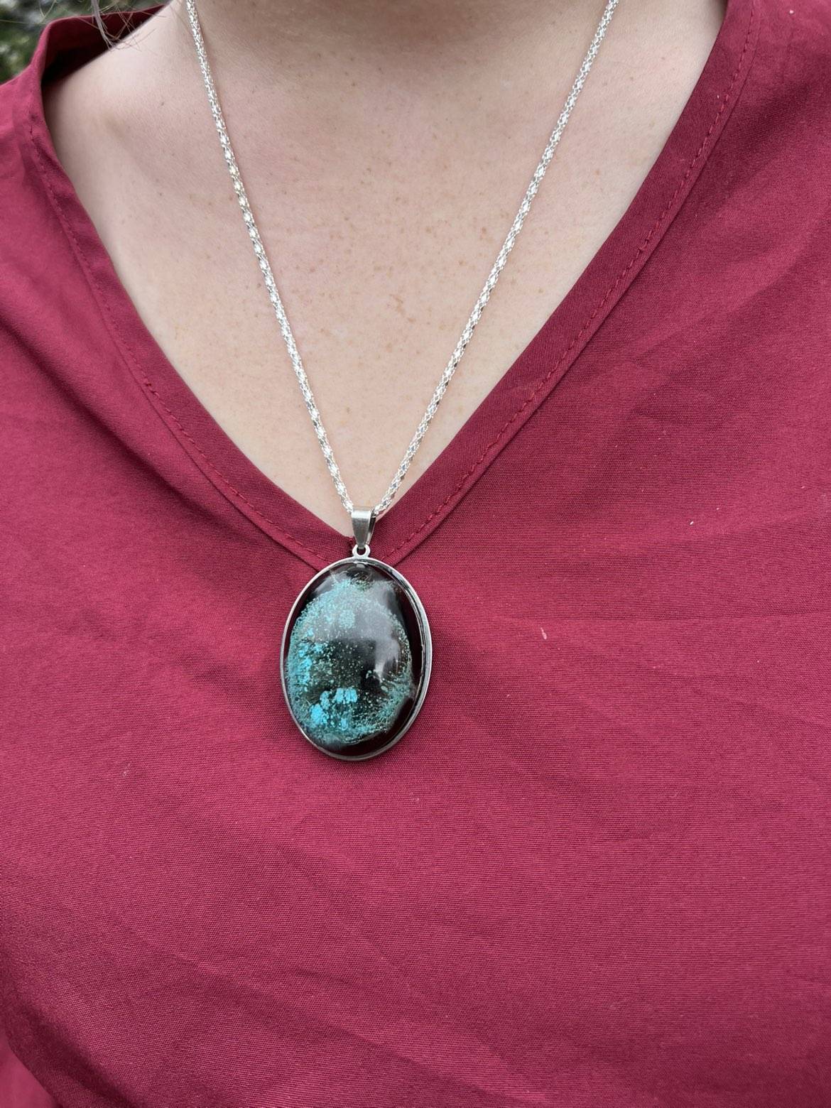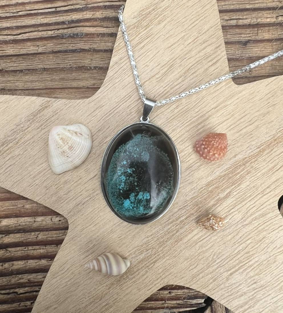 Ce pendentif artisanal en résine époxy révèle un paysage marin fascinant où les nuances de bleu turquoise et les textures évoquent un récif caché sous la surface de l océan. Les pigments se déploient comme des coraux ou des formations récifales.