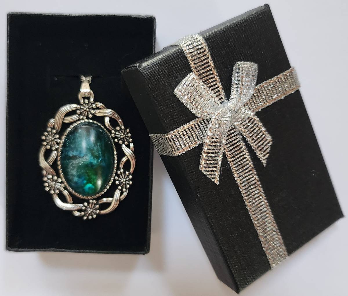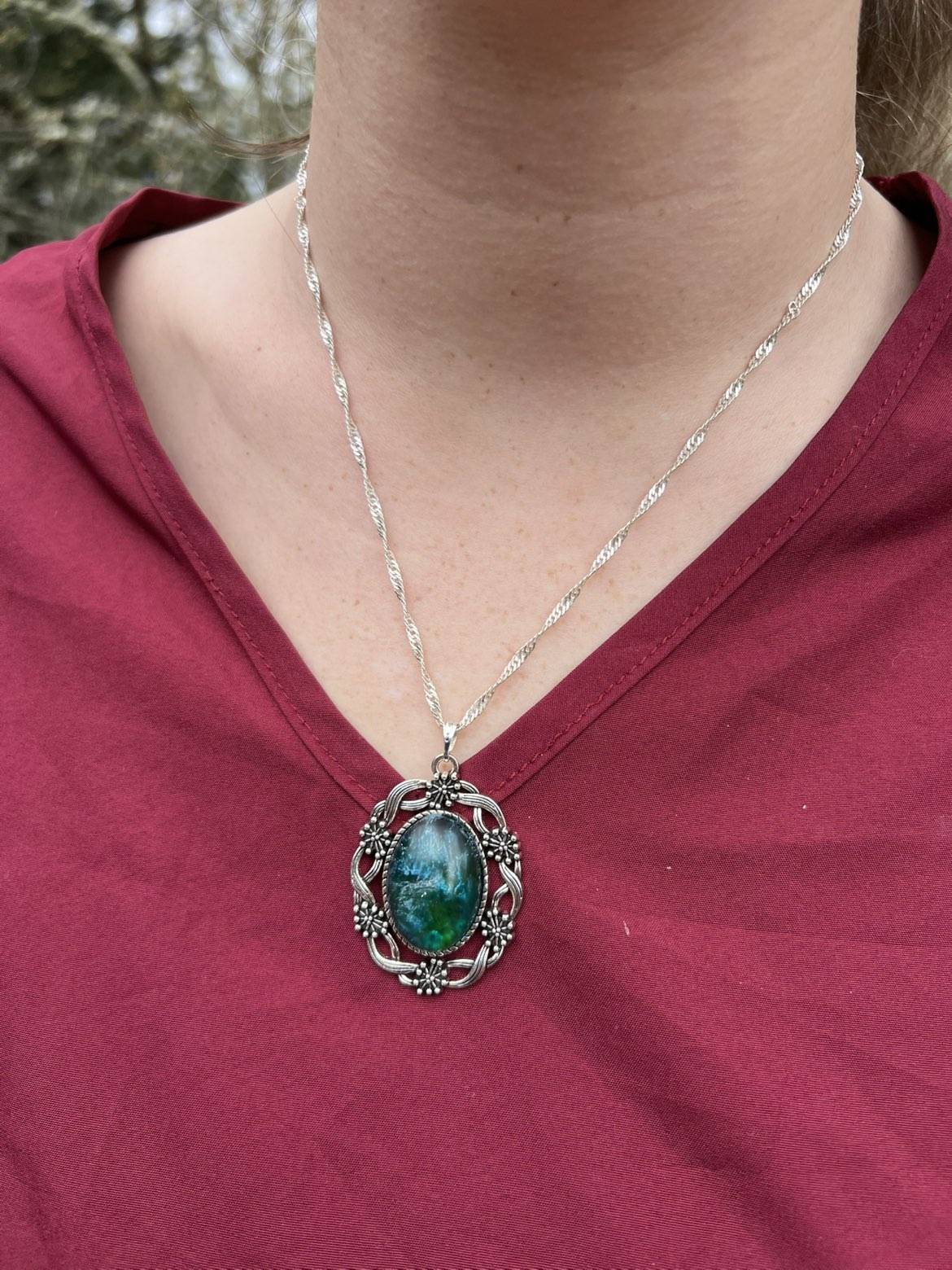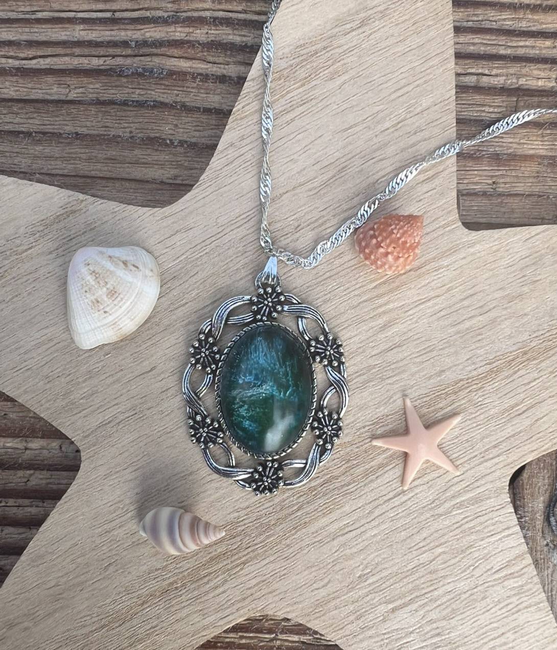 Ce pendentif artisanal en résine époxy dévoile des nuances profondes de bleu et de vert évoquant les paysages mystérieux des fonds marins. Les textures et pigments se déploient comme une végétation marine délicate, rappelant les algues et les coraux doucement animés par les courants.