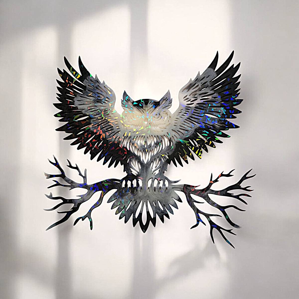 Apportez caractère et originalité à votre intérieur avec cette décoration murale représentant un hibou majestueux aux ailes déployées. Symbole de sagesse, de protection et de clairvoyance, ce hibou artistique attire immédiatement le regard grâce à son design détaillé et ses reflets irisés.